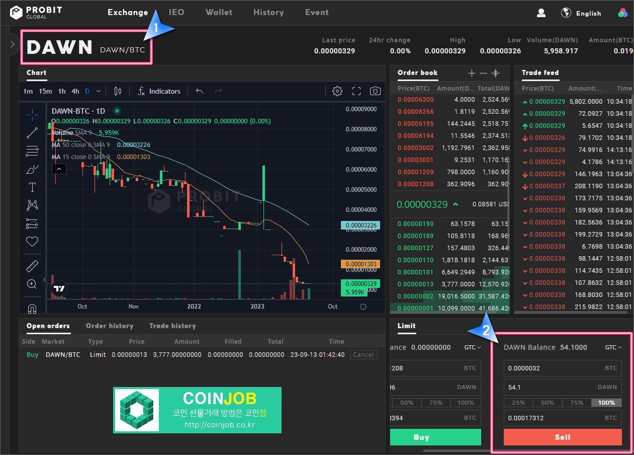 4. DAWN/BTC 거래화면으로 들어오면 업비트에서 프로비트로 입금된 던프로토콜이 매도화면에 수량으로 보여집니다. 저는 따라하기 강좌를 만들려고 소액을 보내서 현재 54.1개를 가지고 있습니다. 이제 던프로토콜을 매도해보겠습니다.