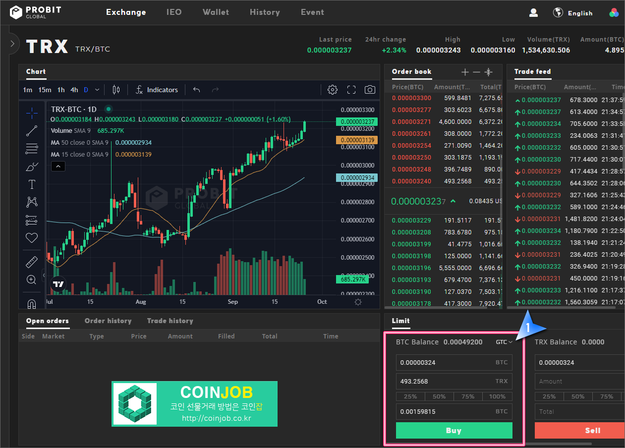 Balance는 현재 BTC 보유 수량, 바로 아래는 트론 호가와 매수 수량을 입력후 "Buy"를 누르면 주문이 제출됩니다. 곧바로 체결하려면 현재 시세보다 낮은 가격의 호가를 입력후 주문하셔야 됩니다.