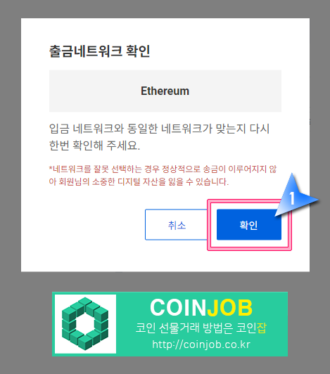 4. 네트워크가 동일한지 묻는 창이 뜹니다. 이더리움 네트워크인 ERC20으로 업비트와 Gate.io가 동일하므로 "확인" 버튼을 클릭합니다.