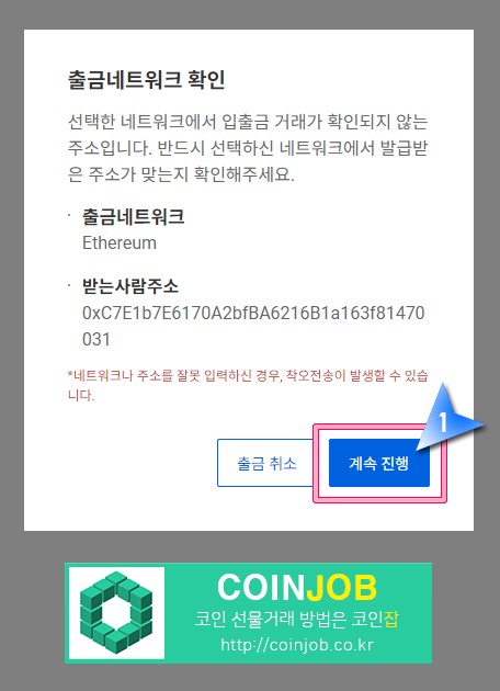 6. 출금 내용을 확인후 "계속 진행" 버튼을 클릭합니다.