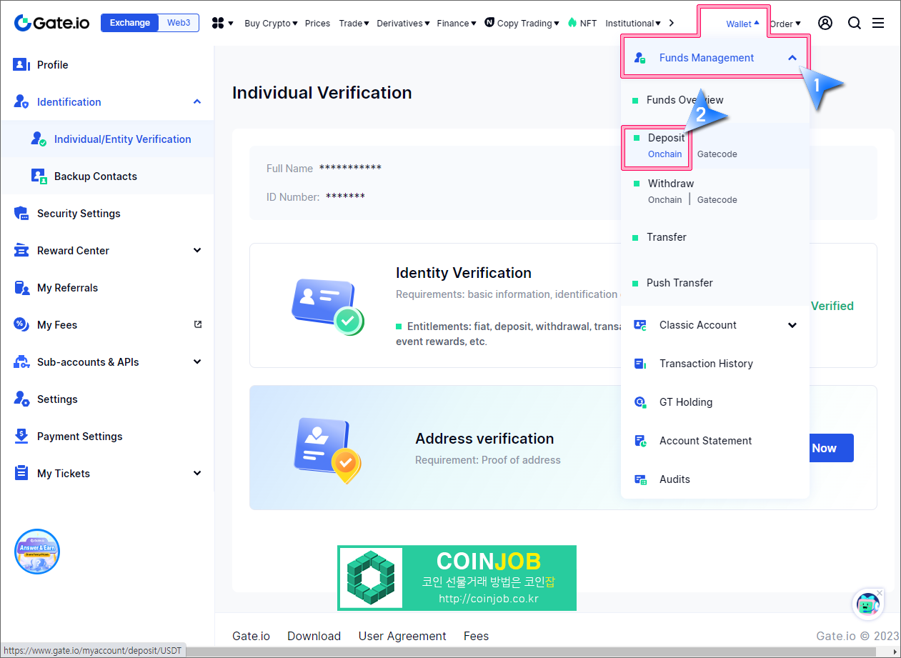 1. Gate.io에서 KYC 신분인증이 완료되었다면 우측 상단의 Wallet를 클릭후, Funds Management 하단에서 Deposit의 Onchain을 선택합니다.