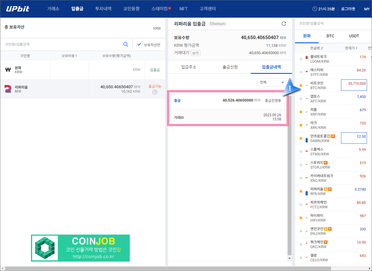 12. 업비트 리퍼리움의 출금화면에서 입출금 내역을 클릭하면 출금 진행상황을 확인할 수 있습니다.