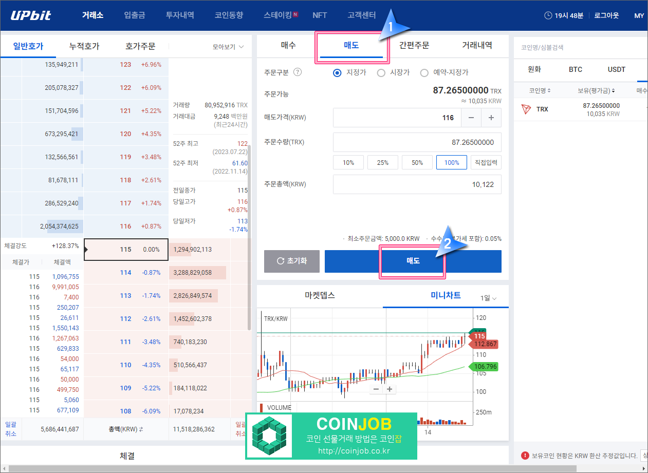 17. 또는 업비트 원화마켓에서 트론을 검색해서 매도화면으로 들어가면 입금된 트론을 확인할 수 있습니다. 이제 트론을 매도후 현금화하시면 되겠습니다.