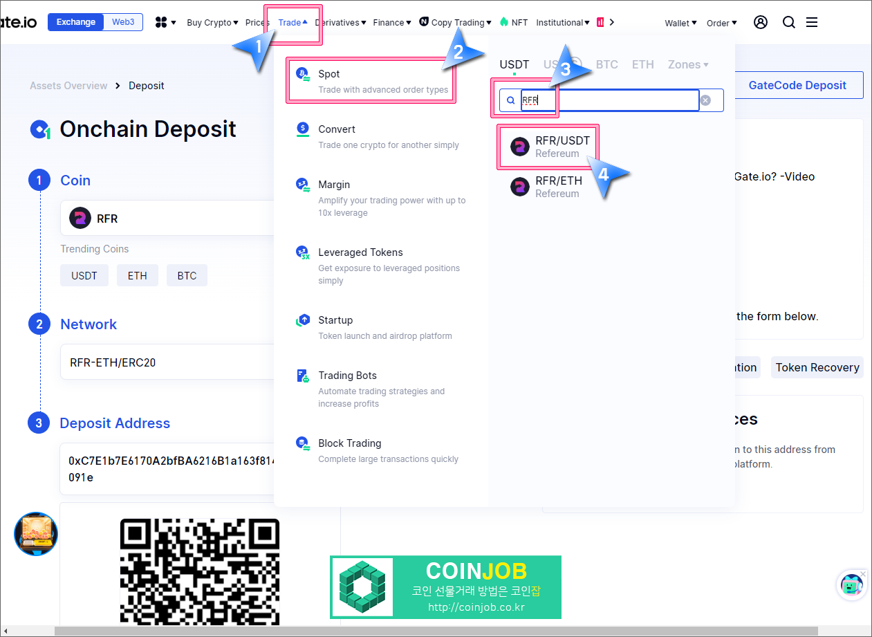 1. 리퍼리움이 Gate.io에 입금되었다면 상단 메뉴중에서 Trade를 클릭한 후, Spot(현물)을 선택합니다. 그리고 우측 검색창에 RFR을 입력후 RFR/USDT를 선택합니다.