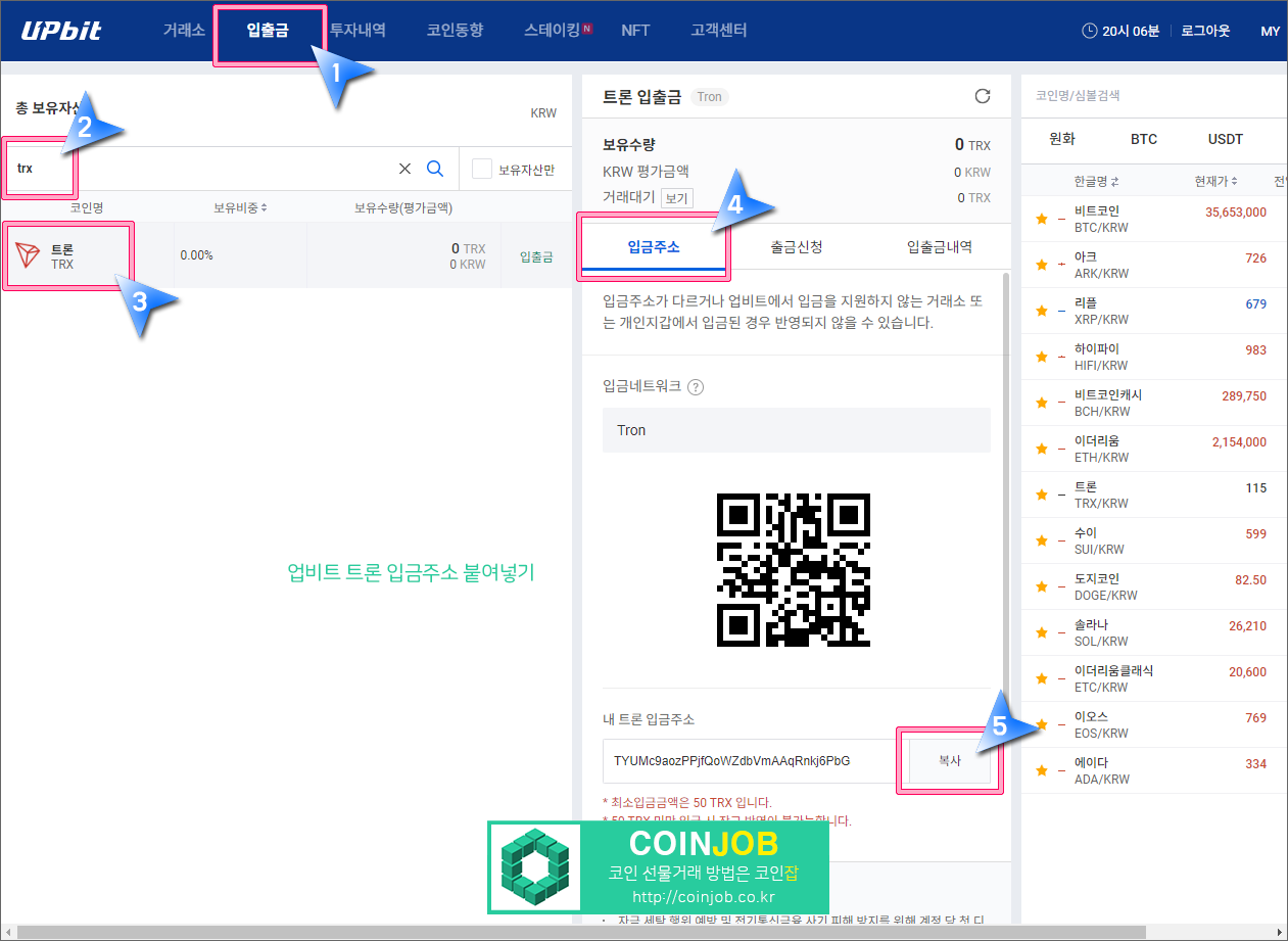 11. 트론의 입금주소를 복사하기 위해서 업비트 입출금 화면에서 검색창에 TRX를 입력해서 검색결과에 나온 '트론'을 선택합니다. 입금주소 탭에서 '내 트론 입금주소' 우측의 복사 버튼을 클릭합니다.