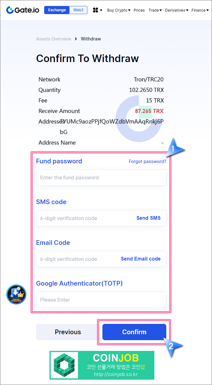 13. 출금화면의 인증 수단은 개인별로 약간 다를 수 있습니다. 저는 무려 4가지 인증 수단을 거쳐야 출금이 가능합니다. ^^ 본인의 출금화면에 나타난 인증을 모두 완료하시고 "Confirm" 버튼을 클릭합니다.