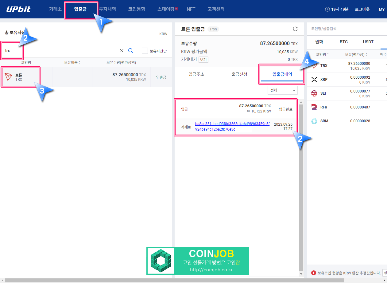16. 트론의 입출금 속도가 빨라서 10분 정도면 업비트에 입금됩니다. 업비트 트론의 입출금 화면에서 입출금내역을 클릭하면 트론이 입금된 것을 확인할 수 있습니다.