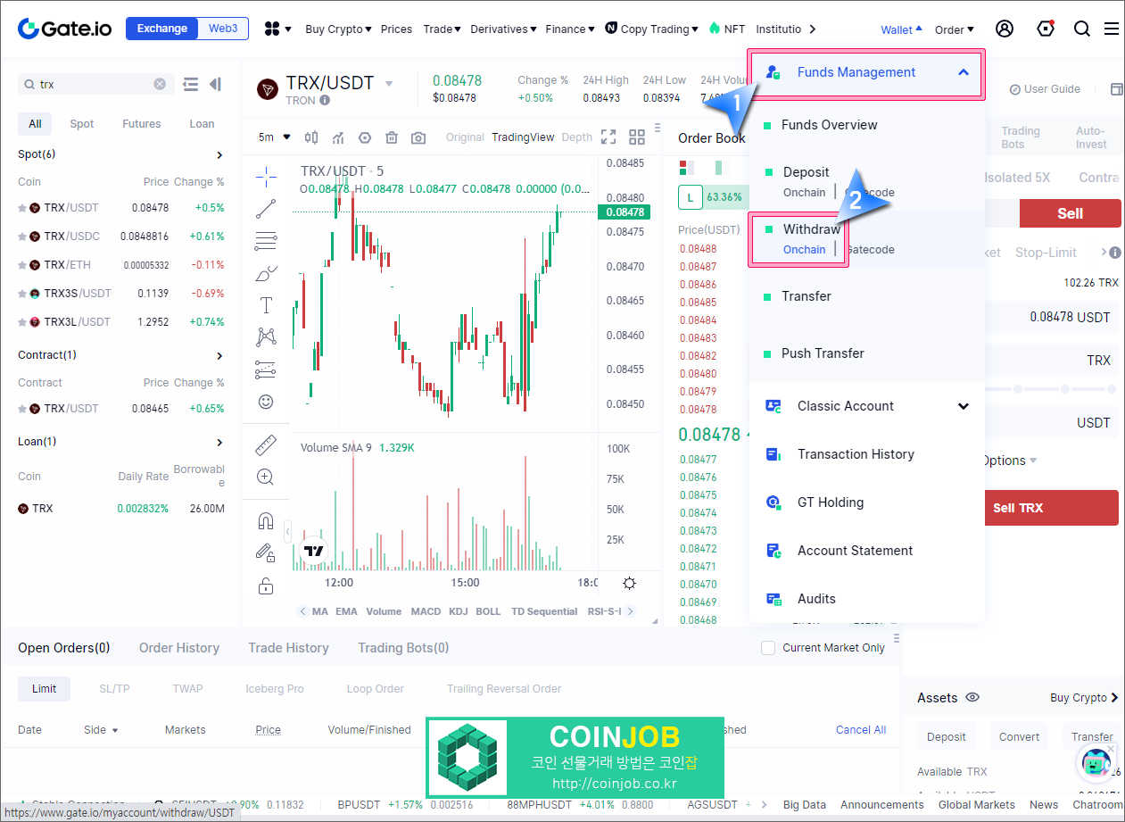 10. Funds Management에서 Withdraw(출금)을 선택후 Onchain을 클릭합니다. 참고로 그 옆에 있는 Gatecode는 게이트아이오 사용자끼리 보낼 때 사용하는 메뉴입니다.