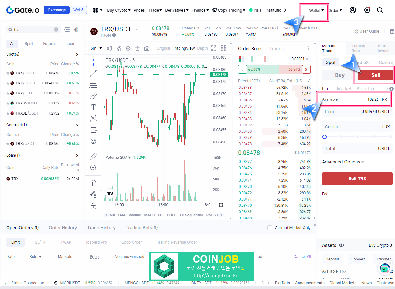 9. 트론이 매수되면 Sell 탭을 클릭했을 때, Available에 트론 수량이 표시됩니다. 이제 국내거래소로 트론을 보낸 후 매도하시면 현금화할 수 있습니다. 트론을 출금하기 위해서 상단의 Wallet를 클릭합니다.