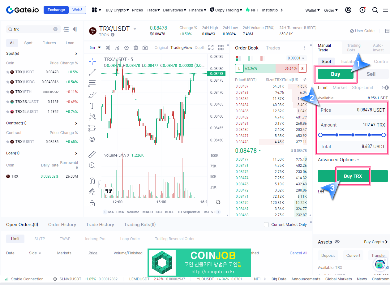 7. TRX/USDT 마켓에서 Buy(매수) 탭을 클릭합니다. Price(가격)과 Amount(수량)을 입력하고 "Buy TRX" 버튼을 클릭해서 주문을 제출합니다.