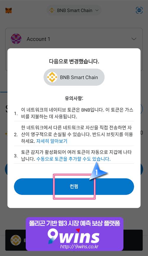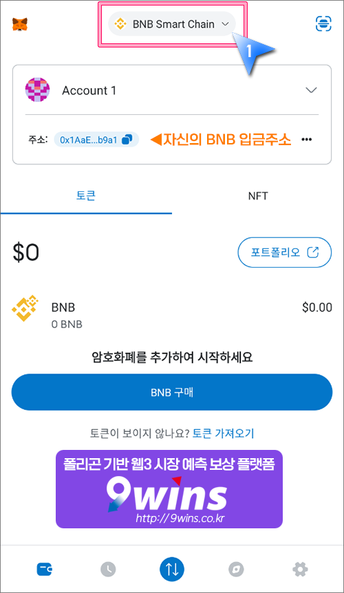 13. 이렇게 BNB Smart Chain 네트워크가 오픈되었습니다. 만약 BNB나 BSC 같은 네트워크 계열의 코인을 메타마스크에 입금하시려면 Account1 아래에 있는 주소를 복사하여 붙여넣기 후 보내시면 코인이 입금됩니다.