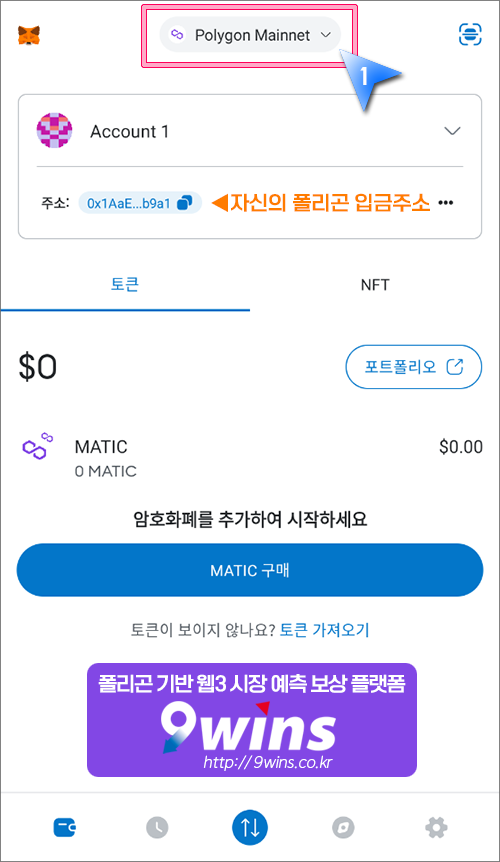 7. 이렇게 폴리곤 네트워크가 오픈되었습니다. Account1아래에 있는 주소가 바로 자신이 폴리곤(Matic)입금 주소입니다. 국내거래소에서 폴리곤을 메타마스크로 입금하실 분들은 네트워크를 'Polygon'을 선택한 후, 아래의 입금주소를 붙어넣기 한 후 보내시면 메타마스크 폴리곤 네트워크에 폴리곤(Matic)이 입금됩니다.