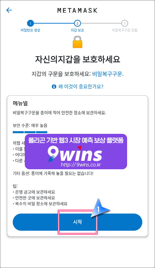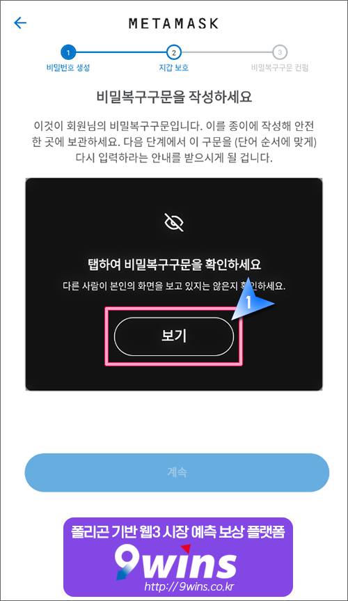 12. 총 12개의 단어로 구성된 비밀복구구문입니다. 무조건 메모를 하셔야 합니다. 이거 잃어버리면 메타마스크에 입금한 코인은 찾지 못할 수 있습니다. 번호 순서와 함께 구문을 메모하셨으면 "계속"을 클릭합니다.