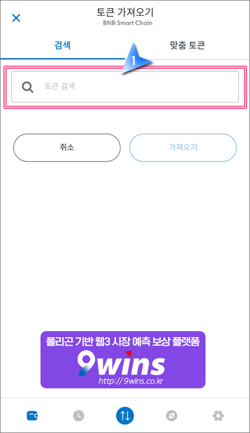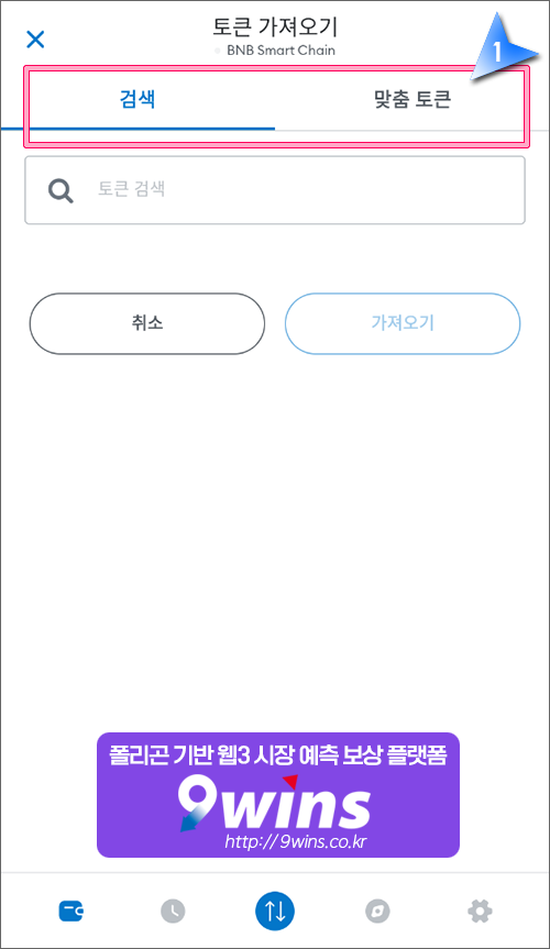 2. 토큰을 추가하는 방법은 2가지입니다. 코인 이름을 검색해서 추가하는 방법과 토큰의 등록 정보를 직접 등록해서 추가하는 맞춤 토큰 추가 방법이 있습니다.