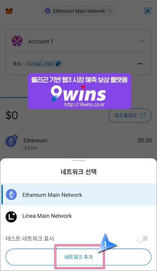 1. 이번에는 메타마스크에서 네트워크를 추가하는 방법에 대해서 배워보도록 하겠습니다. 폴리곤 기반의 코인을 입출금하기 위한 폴리곤 네트워크를 추가해 보도록 하겠습니다. 상단의 Ethereum Main Network를 클릭합니다.
