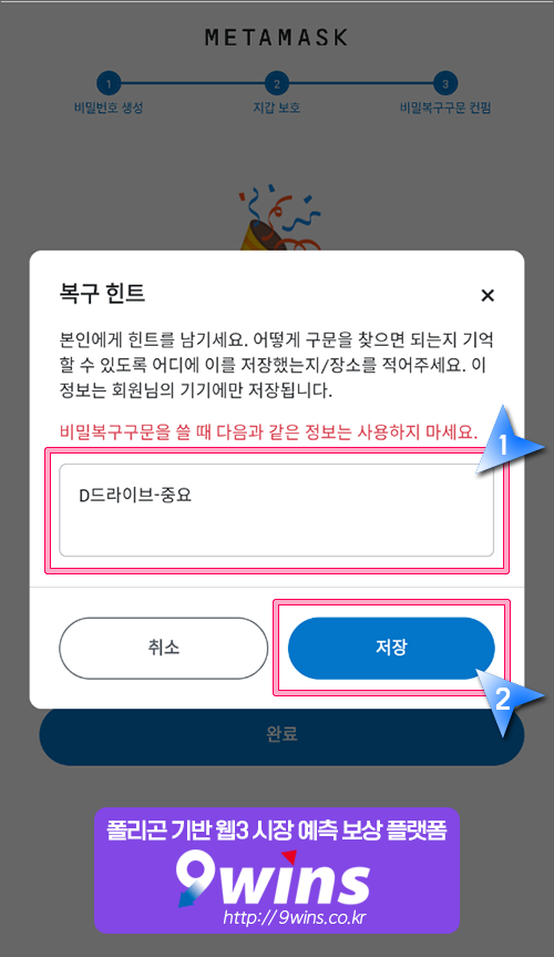 15. "완료"를 클릭합니다. 그리고 어디에 메모를 남겼는지? 또는 어디에 저장했는지 나중에 잊어버릴수 있으니 중간에 있는 "힌트를 남기고 싶으신가요?"를 클릭해서 보관된 장소 등을 메모해둘 수 있습니다.