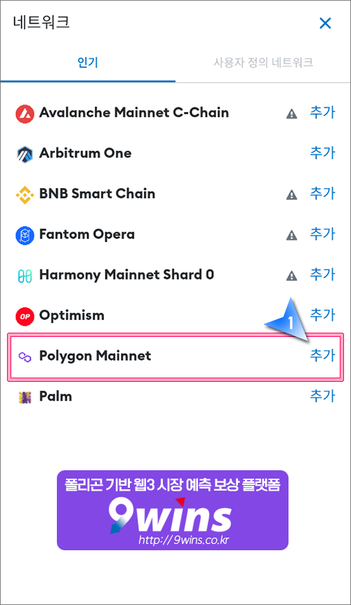 3. Polygon Mainnet 우측의 "추가" 버튼을 클릭합니다.
