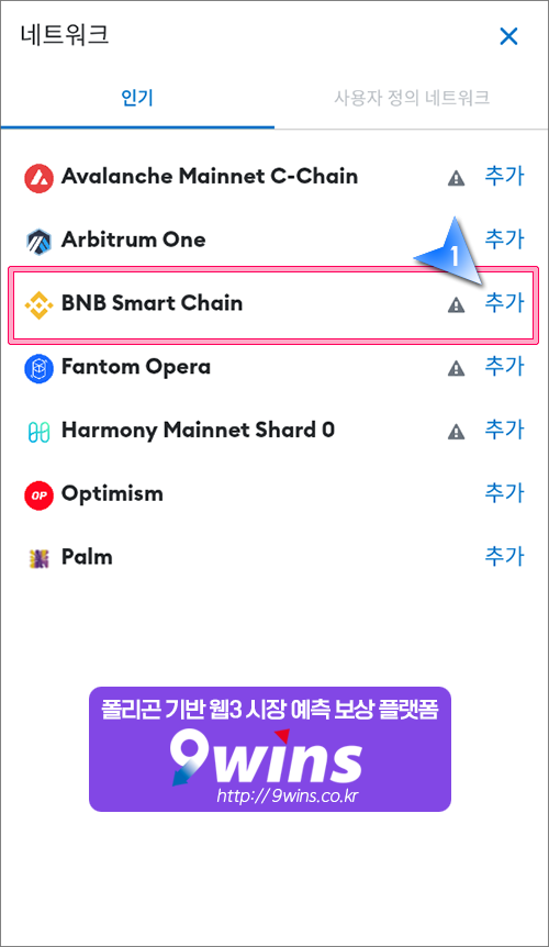9. 인기 탭에서 BNB Smart Chain 우측의 "추가" 버튼을 클릭합니다.
