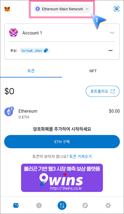 1. 이번에는 메타마스크에 토큰을 추가하는 방법에 대해서 알아보도록 하겠습니다. 토큰을 추가하기 위해서 하단의 "토큰 가져오기"를 클릭합니다.