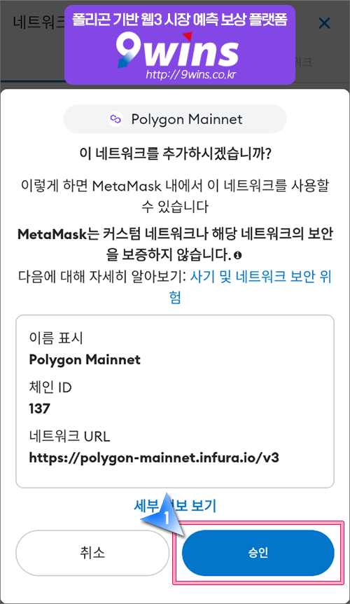 4. "승인" 버튼을 클릭해주시면 폴리곤 네트워크가 추가됩니다. 만약 위의 이미지에서 '인기' 탭에 Polygon Mainnet이 보이지 않는다면 아래 내용을 수동으로 추가해주시면 폴리곤 네트워크를 추가할 수 있습니다.