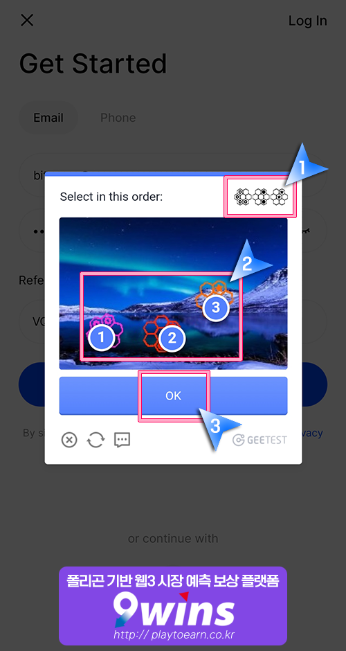6. 자동 가입 방지를 위한 그림모양 순서 맞추기입니다. 우측 상단의 그림모양과 동일한 순서대로 클릭후 OK 버튼을 클릭합니다.