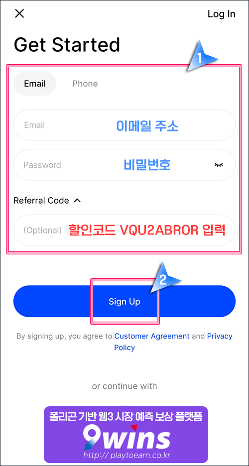 이메일 주소와 비밀번호를 입력 후, Referral Code 옆에 있는 ^ 버튼을 추천코드를 입력할 수 있습니다. VQU2ABROR 를 입력하시면 수수료가 할인되니 꼭 할인받고 가입하시기 바랍니다.