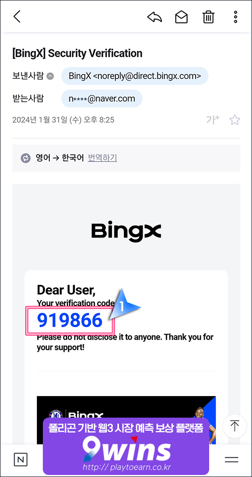 8. 이렇게 BingX로부터 이메일이 도착하는데 인증코드 6자리를 위의 화면에 입력해주시면 됩니다.