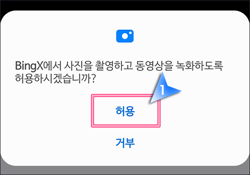 7. BingX에서 사진 촬영과 동영상 녹화를 허용할지 묻는 창이 뜨면 "허용"을 클릭합니다. 혹시 습관적으로 '거부'를 눌러버렸다면 휴대폰 맨 상단의 톱니바퀴 설정 버튼을 클릭후, '애플리케이션'에서 Bingx를 검색하셔서 '권한' 탭에서 '사진 및 동영상 엑세스 권한'을 "허용"으로 변경해주시면 됩니다.