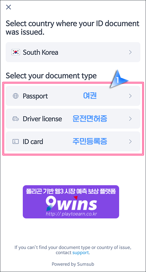 6. 자신이 사용할 신분증을 선택합니다. Passport는 여권, Driver license는 운전면허증, ID card는 주민등록증입니다.