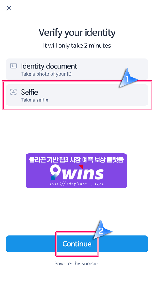 5. 인증 신청까지는 대략 2분 정도 소요되며, 신분증 촬영후 업로드와 얼굴 셀카 인증이 진행됩니다. 먼저 Indentity document를 선택하고 Continue를 클릭합니다.