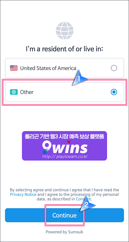 4. 미국 이 외의 지역인 Other를 선택하고 Continue를 클릭합니다.