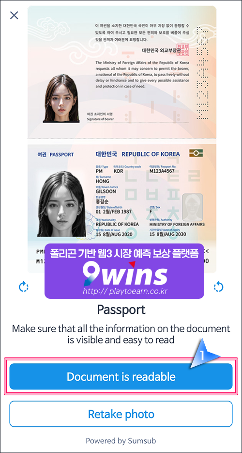 8. 빛 번짐에 주의하면서 선명하게 여권이나 신분증을 촬영하고, "Document is readable"을 클릭하여 신분증을 업로드 합니다.