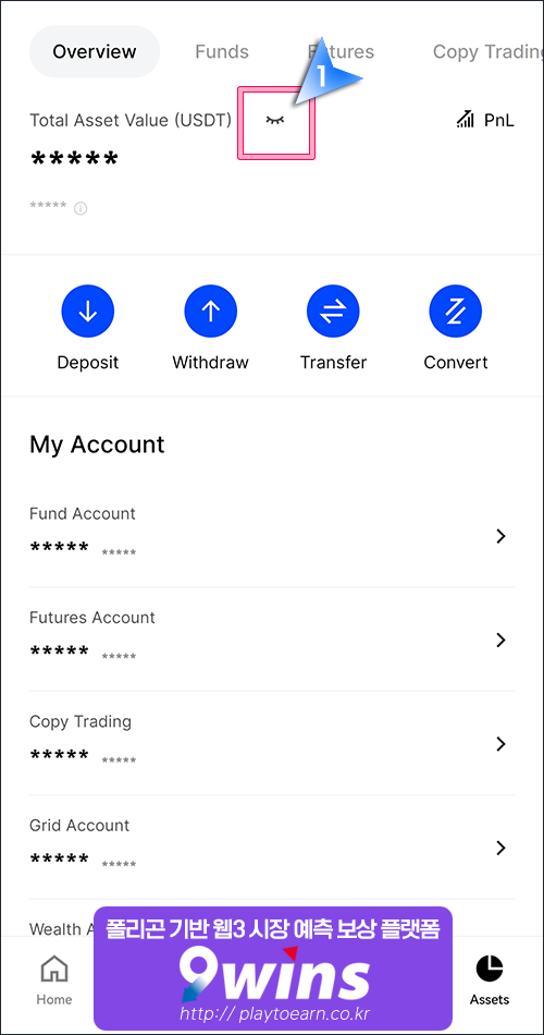 2. 처음 Assets를 클릭하면 자산 현황이 별표 표시(*)로 보이는데 눈 모양 아이콘을 클릭하면 정상적으로 보여집니다. 이 기능은 공개된 장소에서 자신의 코인 자산 현황을 보호하기 위한 조치라고 합니다.