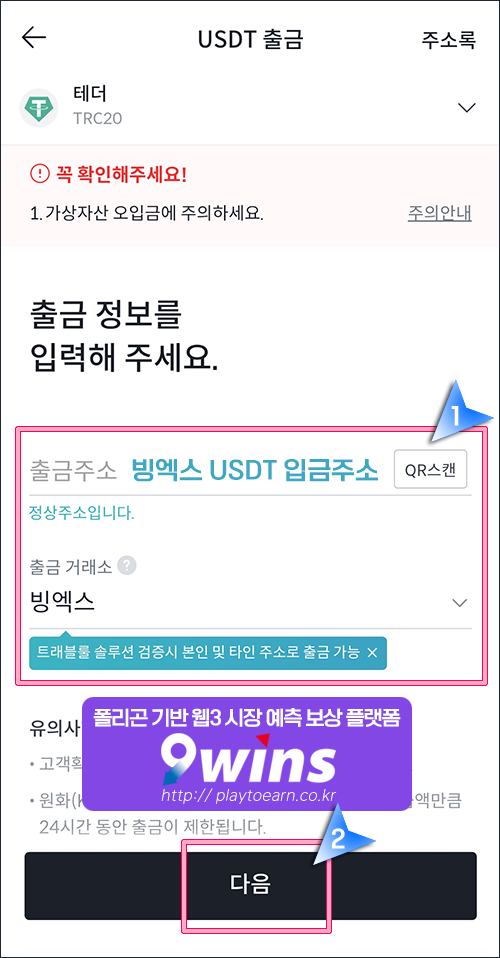 12. 출금 주소칸에 방금 전에 BingX에서 복사한 USDT의 입금주소를 붙여넣기 하면 정상적인 주소인가 검색이 진행되고 몇초후 하단에 "정상주소입니다"라고 뜨면 됩니다. 출금거래소 목록에서 "빙엑스"를 선택한 후, "다음"을 클릭합니다. 참고로 자주 빙엑스로 출금을 진행하시려면 우측 상단의 '주소록'에 미리 빙엑스의 USDT 출금주소를 등록해두시면 편리합니다.