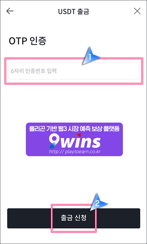 16. 빗썸에 등록한 OTP 인증번호를 입력하고 "출금 신청" 버튼을 클릭합니다.