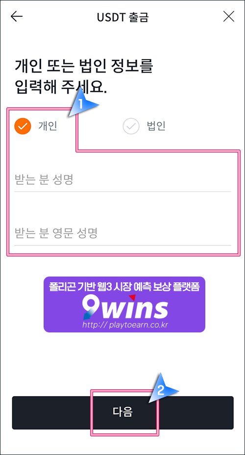 13. 개인을 선택하고, 본인의 한글 성명과 빙엑스에 등록된 본인의 영문 성명을 입력한 후, "다음"을 클릭합니다.