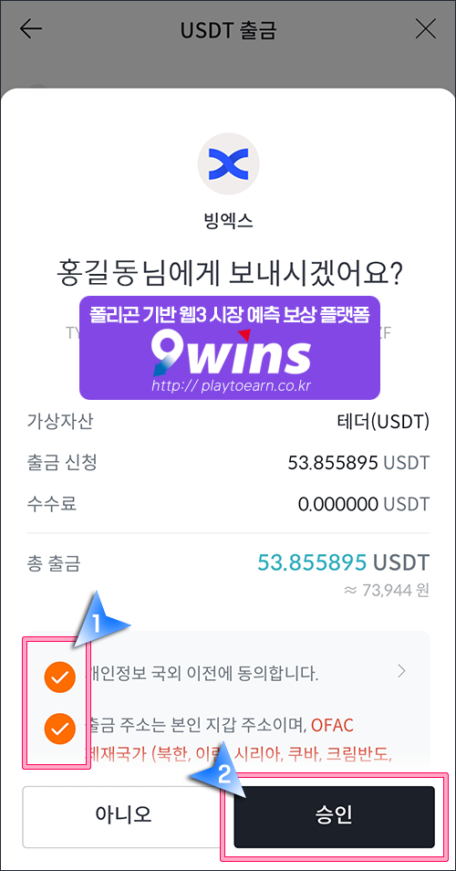 15. 출금 내용을 확인하시고, 개인정보 국외 이전 동의와 본인의 지갑 주소에 체크하신 후, "승인" 버튼을 클릭합니다.