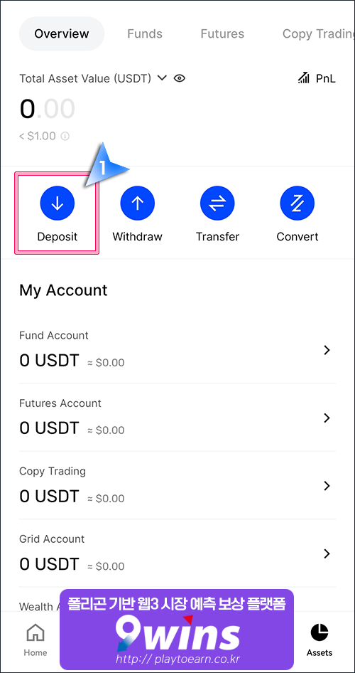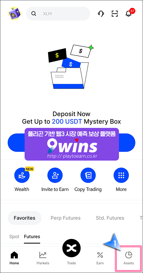 1. 빙엑스(BingX) 거래소 앱 우측 하단의 Assets를 클릭합니다.