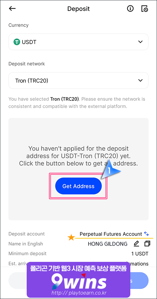 6. Get Address를 클릭합니다. 하단의 Deposit account를 선택하시고, Name in English에서 본인의 영문이름이 맞는지도 확인하시기 바랍니다. 트래블룰에 의해서 국내거래소와 BingX거래소에 등록된 본인의 영문 이름이 동일해야 합니다.