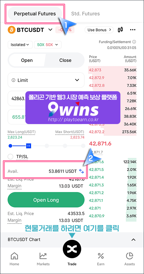 선물거래 화면에서 현물거래 화면으로 이동하려면 앱 하단의 Trade X 버튼을 터치하시면 됩니다.