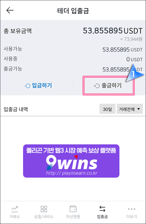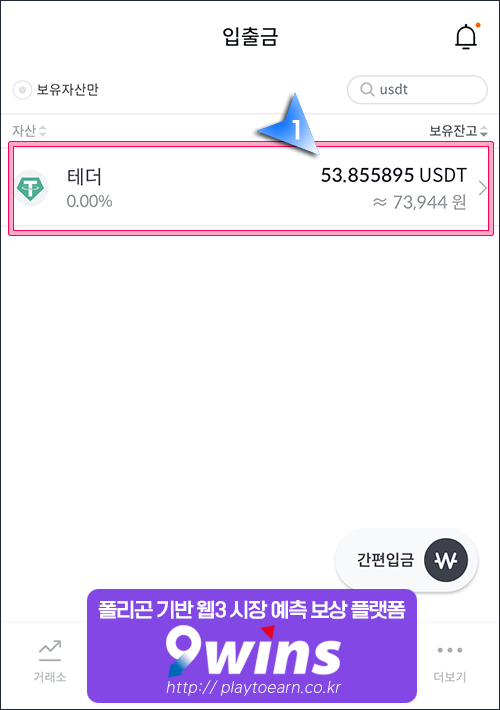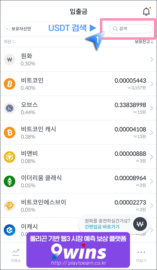 9. 입출금 화면의 검색창에 USDT를 검색합니다.