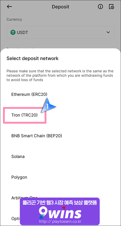 5. 입금 네트워크를 선택하라고 나오는데 국내 거래소와 BingX 거래소의 네트워크를 동일하게 선택해줘야 합니다. 현재 USDT를 지원하는 빗썸과 코인원 모두, TRC20인 트론 네트워크를 지원하고 있어서 Tron(TRC20)을 선택합니다.