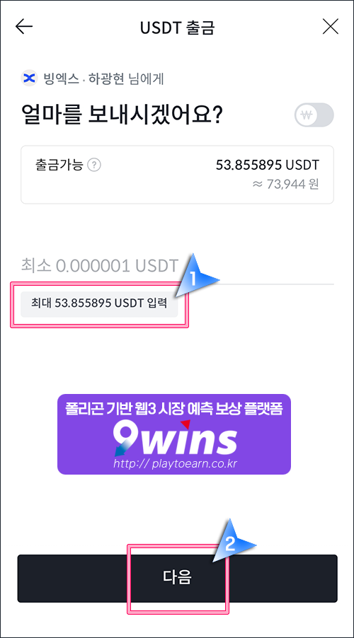 14. 출금 수량을 직접 입력하거나 전부 다 보내려면 "최대"라고 써진 부분을 클릭하면 전체가 자동 입력됩니다. "다음"을 클릭합니다.