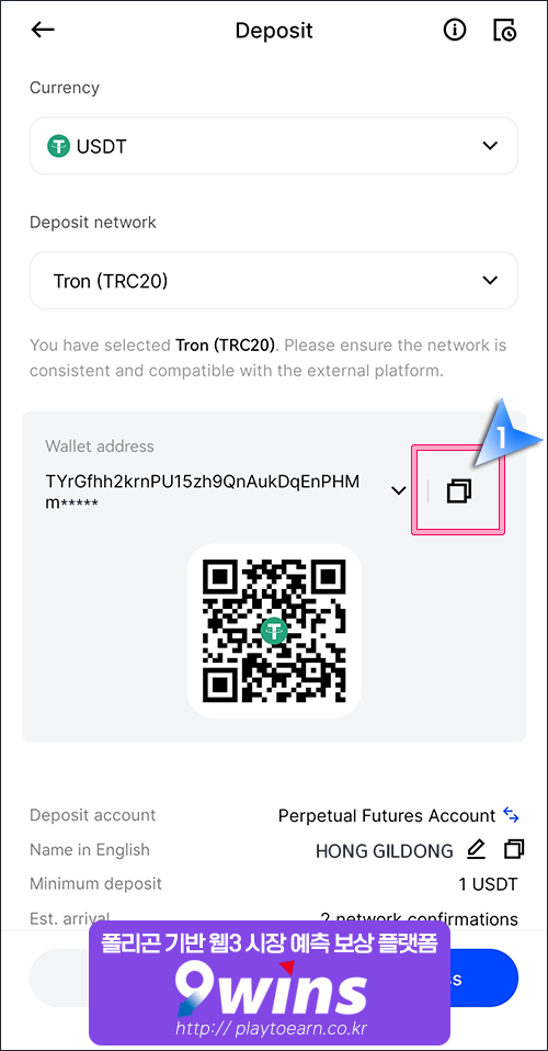 7. Wallet address 우측의 복사 버튼을 눌러서 자신의 USDT 입금주소를 복사합니다.