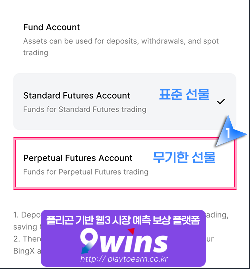참고로 하단에 Deposit account라고 입금되는 지갑을 선택할 수 있습니다. 일반적으로 코인 선물거래를 하기 위해서는 Perpetual Futures Account(무기한 선물거래 지갑)를 선택하시면 됩니다. 현물거래를 하시려면 Fund Account를 선택합니다.
