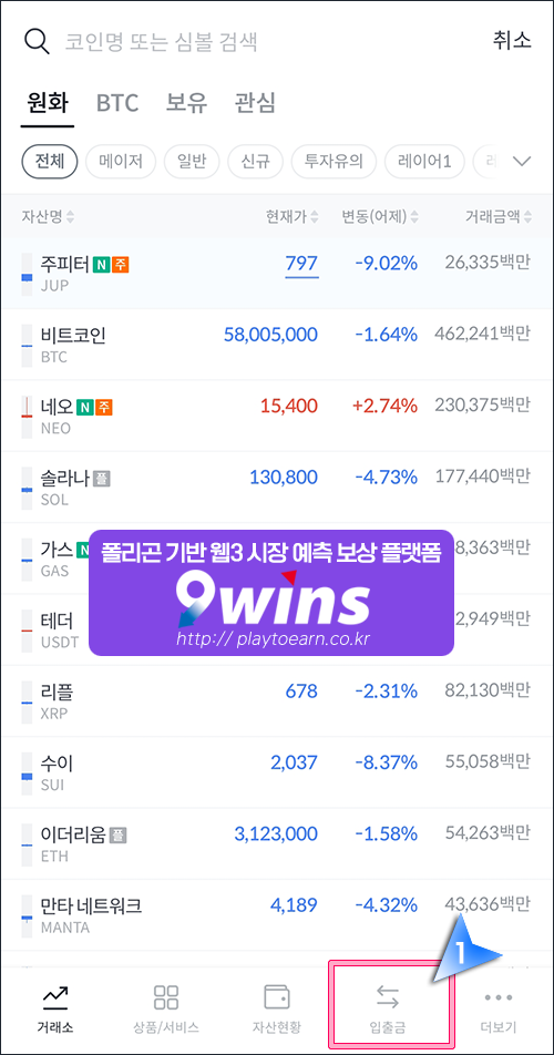 8. 빗썸으로 돌아와서 BingX로 보낼 USDT를 미리 매수해 두고 하단의 "입출금" 버튼을 클릭합니다.