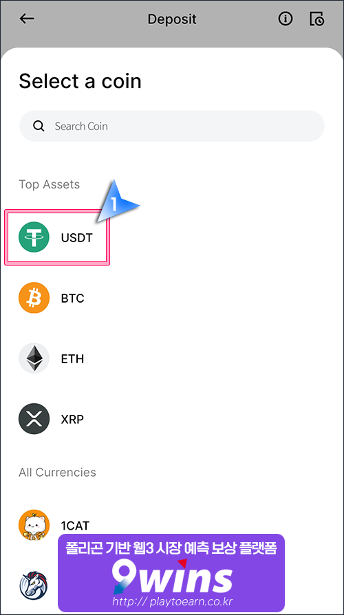 4. 코인 선택 화면에서 USDT를 클릭합니다. 코인 선택화면에 USDT가 보이지 않는다면 Search Coin 검색창에서 USDT를 검색하시면 됩니다.