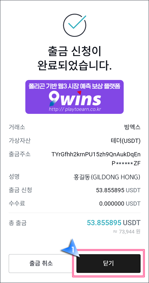17. 출금 신청이 완료되었습니다. 출금이 완료되기까지는 대략 5분~30분 정도가 소요됩니다. "닫기" 버튼을 클릭하고 몇분후 BingX에 접속하여 USDT가 입금되었는지 확인합니다.