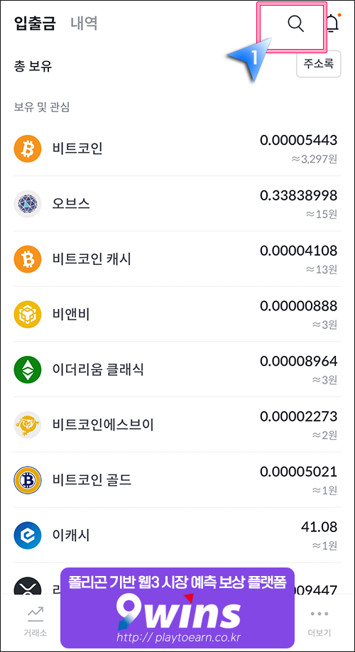 1. 먼저 USDT의 입금주소가 필요하므로 빗썸 앱 하단의 "입출금" 버튼을 클릭합니다.