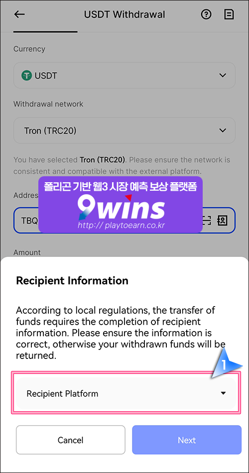 11. 출금 네트워크(withdrawal network)는 반드시 빗썸과 동일한 트론(TRX) 네트워크인 TRC20을 선택합니다.